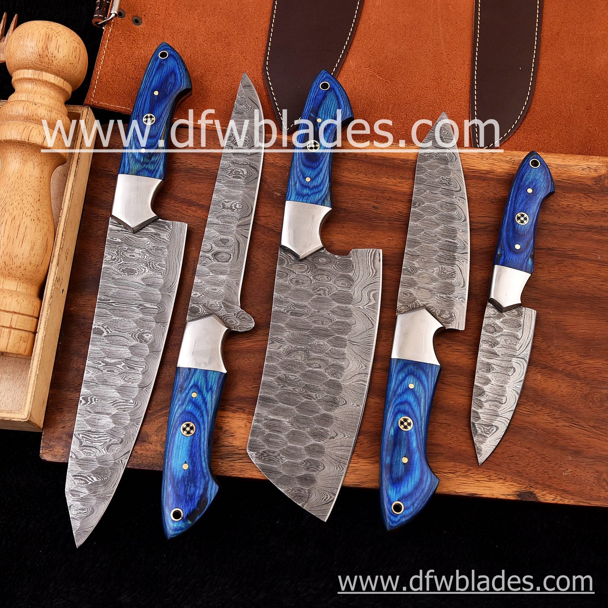 Blue handles 5 pcs set- Handmade Damascus Forged steel chef knives set